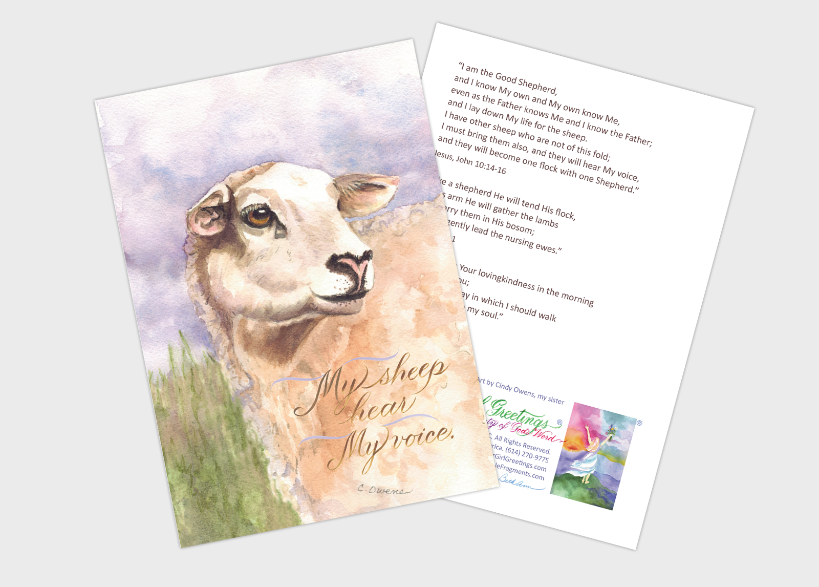 This card was created with watercolor on Arches Aquarelle Cold-Pressed watercolor by my sister, Cindy Owens. FGG artist, Beth Ann, superimposed her original calligraphy on the art. The image was printed on high-quality matte cardstock. Please see the Postcards category to view Cindy’s other art – In His pasture.