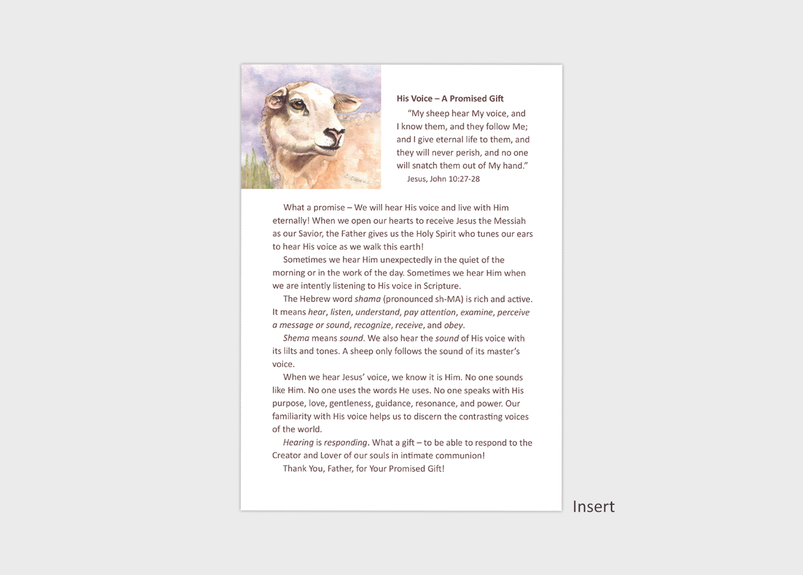 The one-page insert contains an encouraging devotional called His Voice – A Promised Gift with John 10:27-28 as the reference. The three verses on the back of the insert are: John 10:14-16; Isaiah 40:11; and Psalm 143:8.