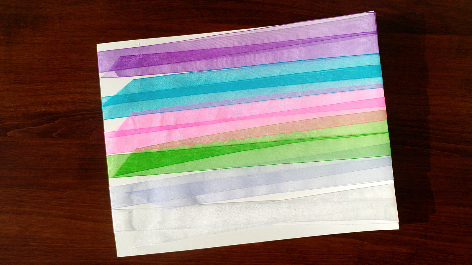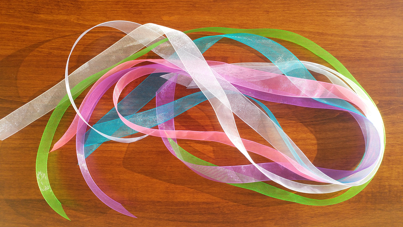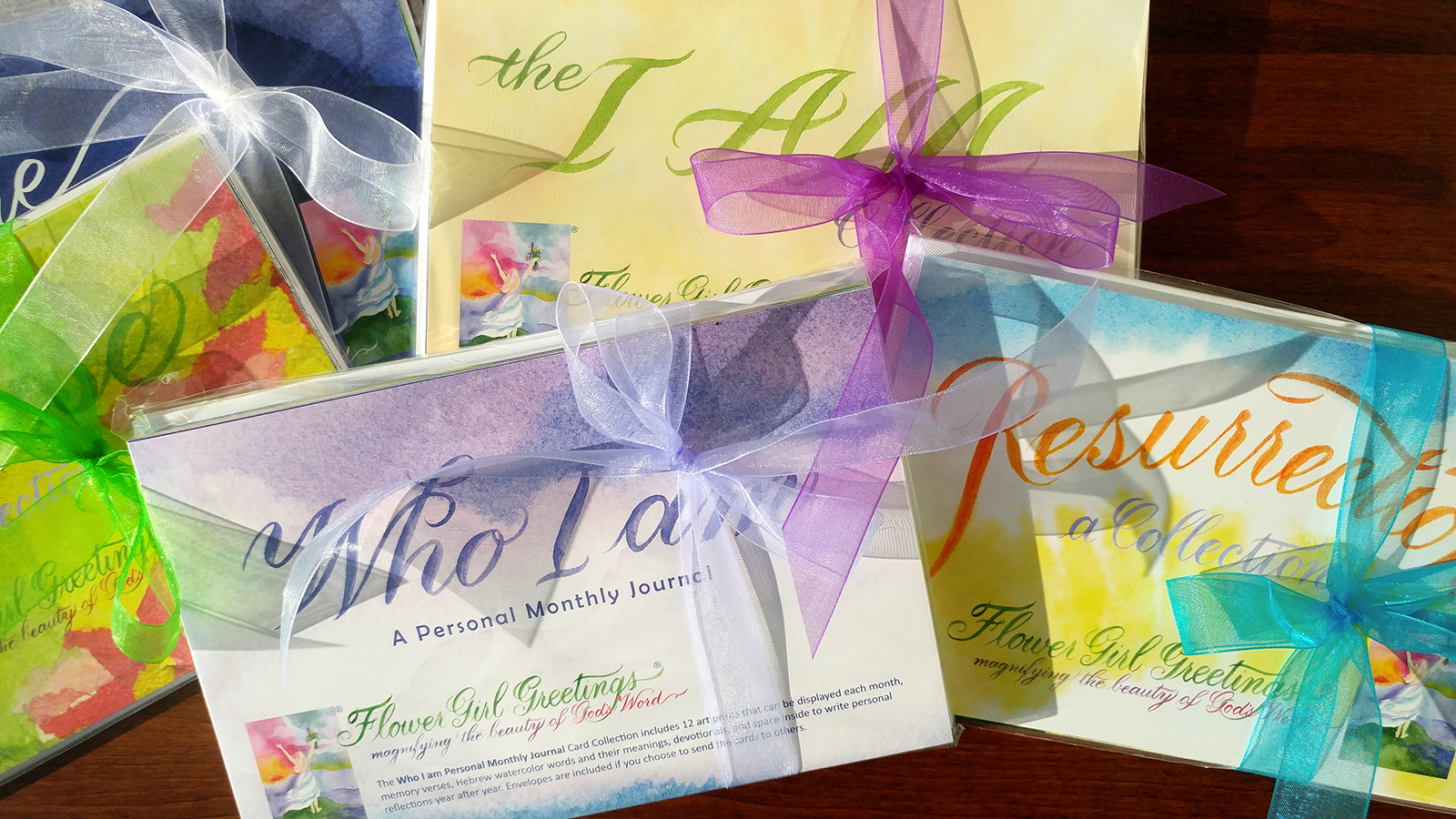 $4.00 for an assortment of 6 organza ribbons for your Flower Girl Greetings Gift Collections. The 6 colors are white, lavender, turquoise blue, purple, bright green, and bright pink. No other gift wrap is needed, since the Collections are already covered with artistic designs. To make them easy to carry to an event, please consider our purple bags with tissue also found in our Shop.