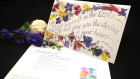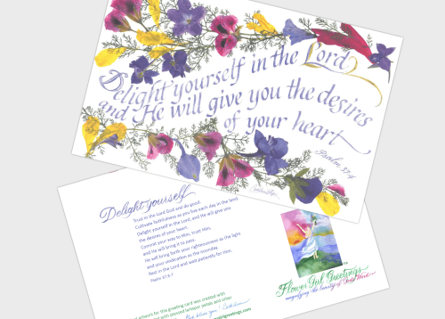 They were created with pressed flowers and pointed-pen calligraphy. The Delight Yourself card was created with italic lettering.