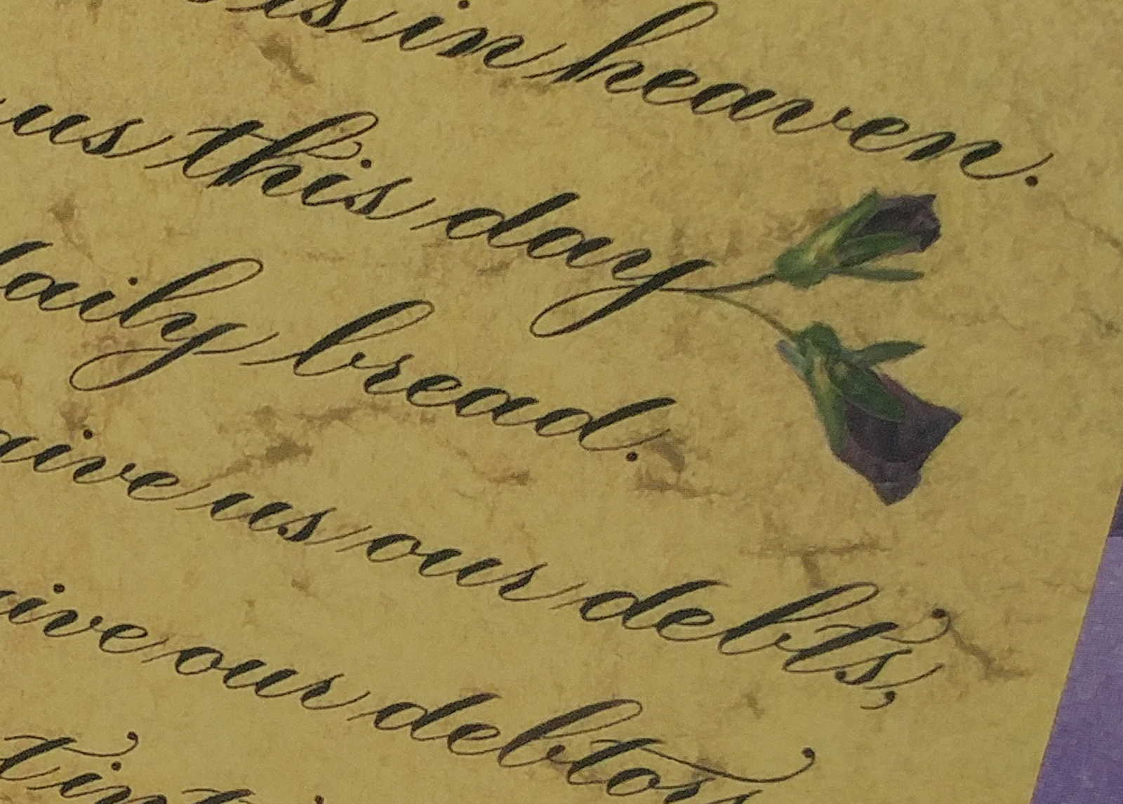 The Lord’s Prayer from Matthew 6:9-13 is scripted on the front.