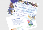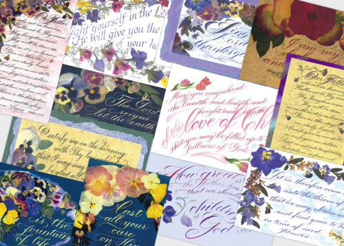 They were created with pressed flowers and pointed-pen calligraphy. The Delight Yourself card was created with italic lettering.
