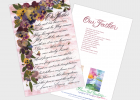 A pressed-flower design with pointed-pen calligraphy using white gouache (opaque watercolor).