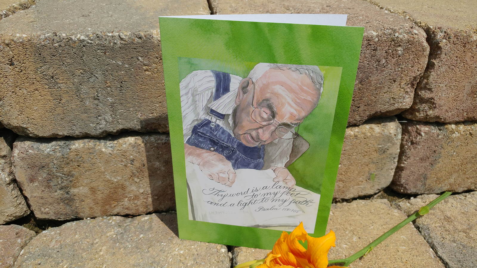 This card is a painting of a friend’s father who inspires me with his loyalty to the Lord Jesus Christ over many years and his passion for his Lord’s love letter, the Bible.
