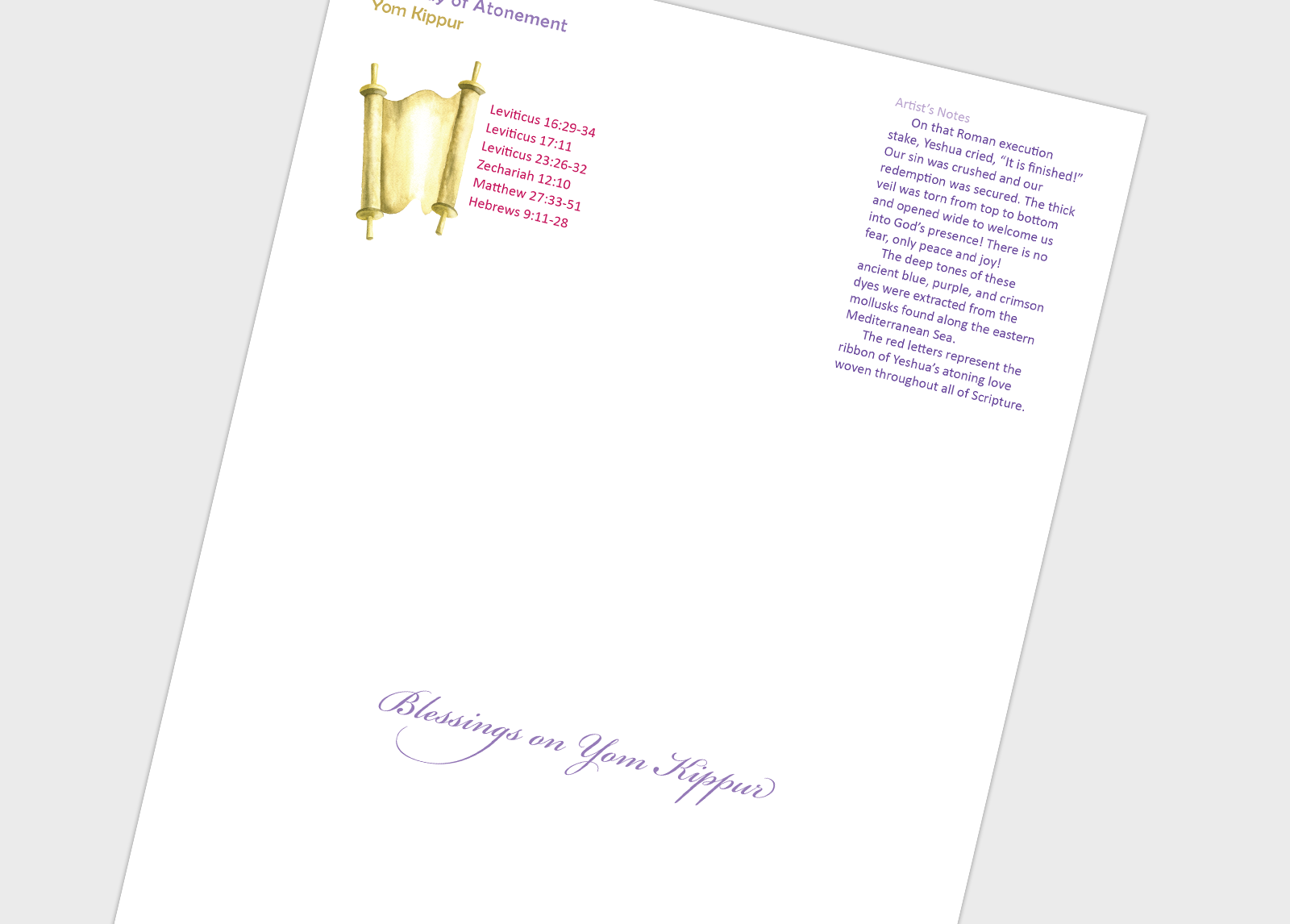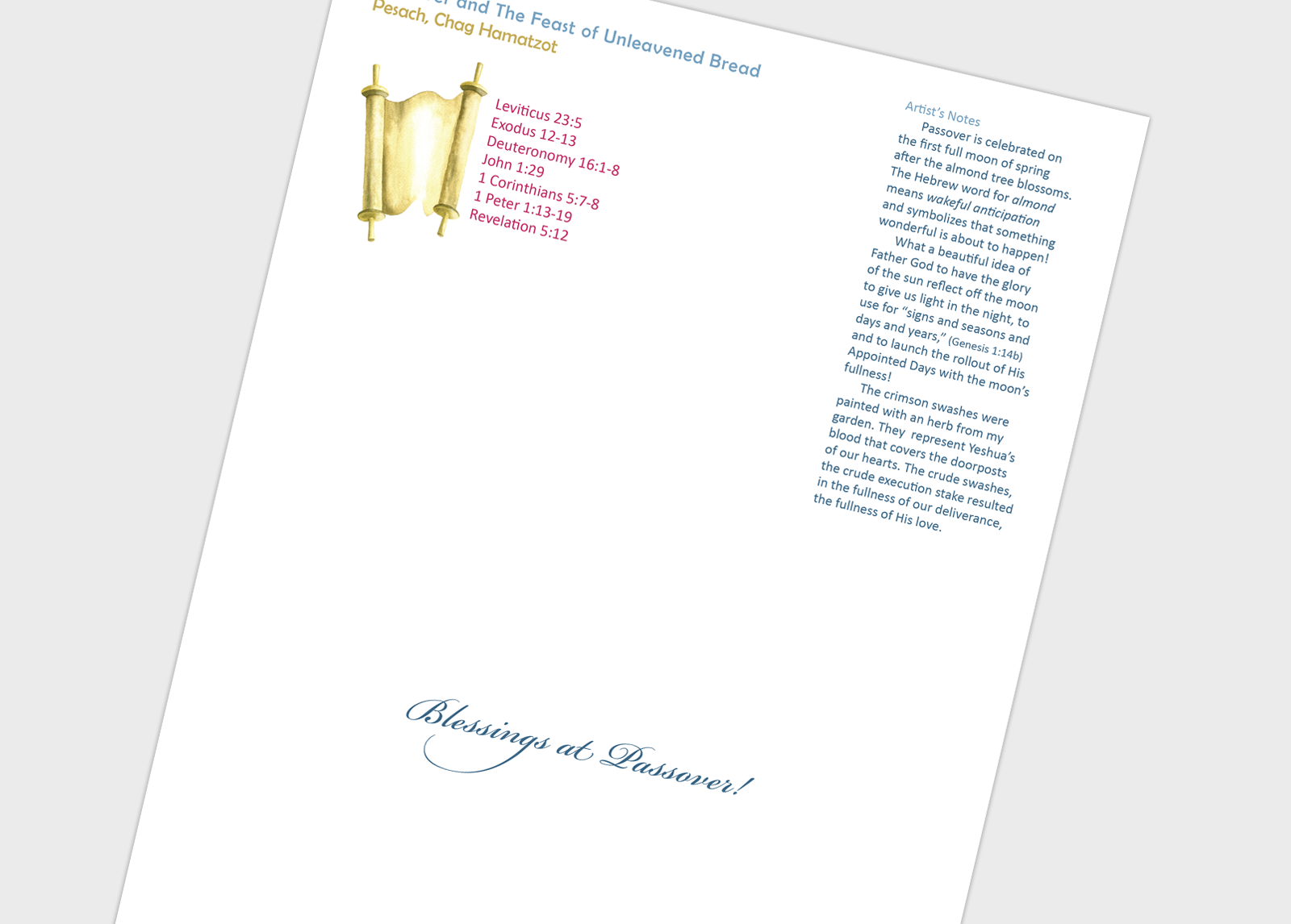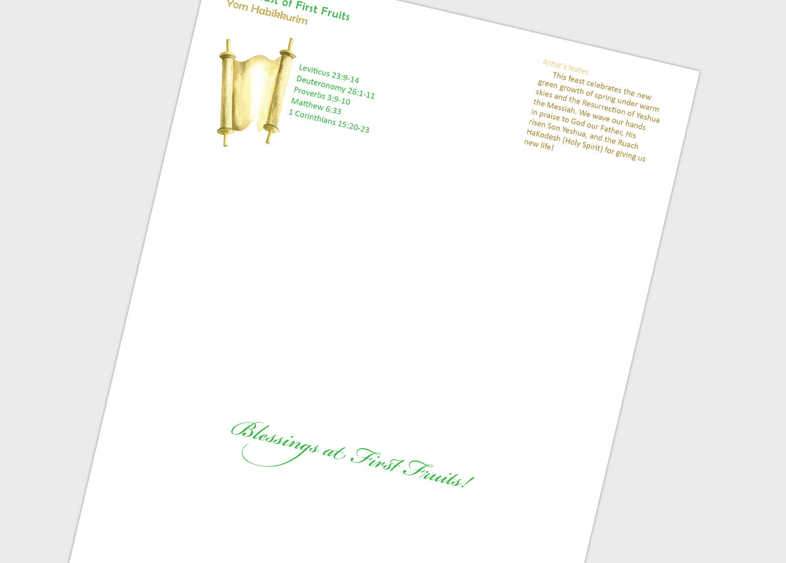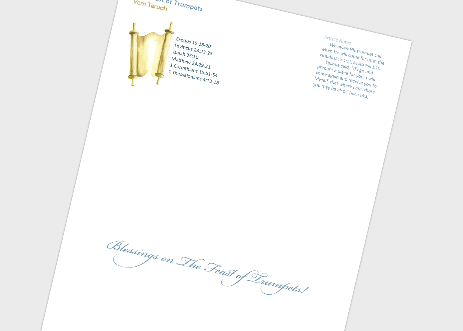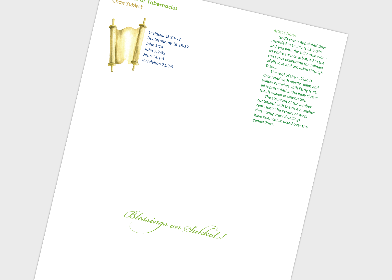 The back of this Feast Art Card includes the Old and New Covenant connections. The inside includes the English and Hebrew name of the Feast, Scripture reference, the artist's notes and a celebration greeting!