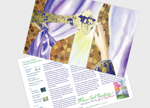 This rich Collection of 8 watercolor art cards celebrates the fulfillment of the Feasts of Israel by Yeshua (Jesus) the Messiah. The artwork on the front of each card was designed to convey Old and New Testament truth. The back of each card includes the story behind each feast and Yeshua's fulfillment of the feast. The inside of each card includes the English and Hebrew names of each feast, Scripture references, the artist’s notes and a celebration greeting!