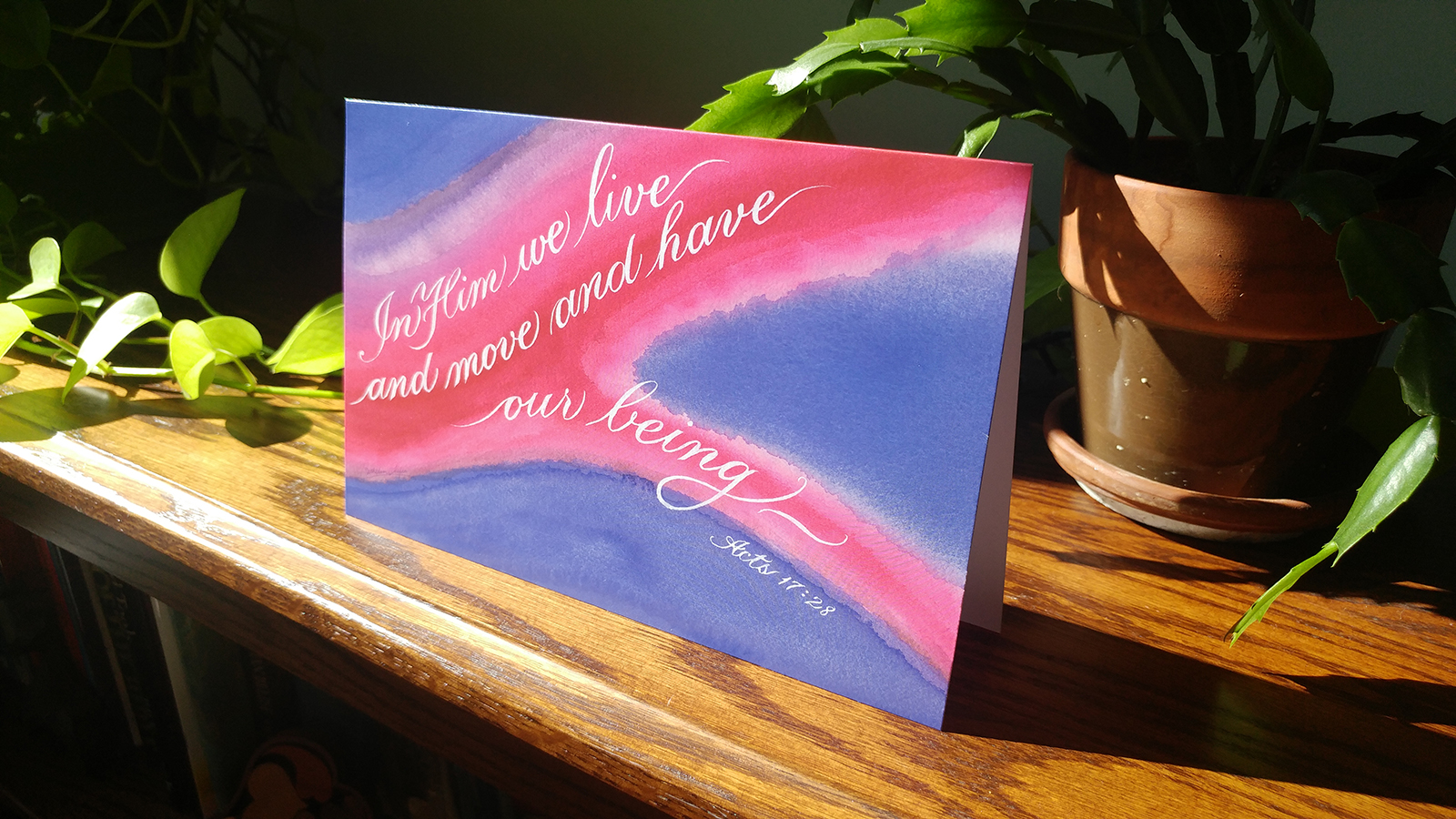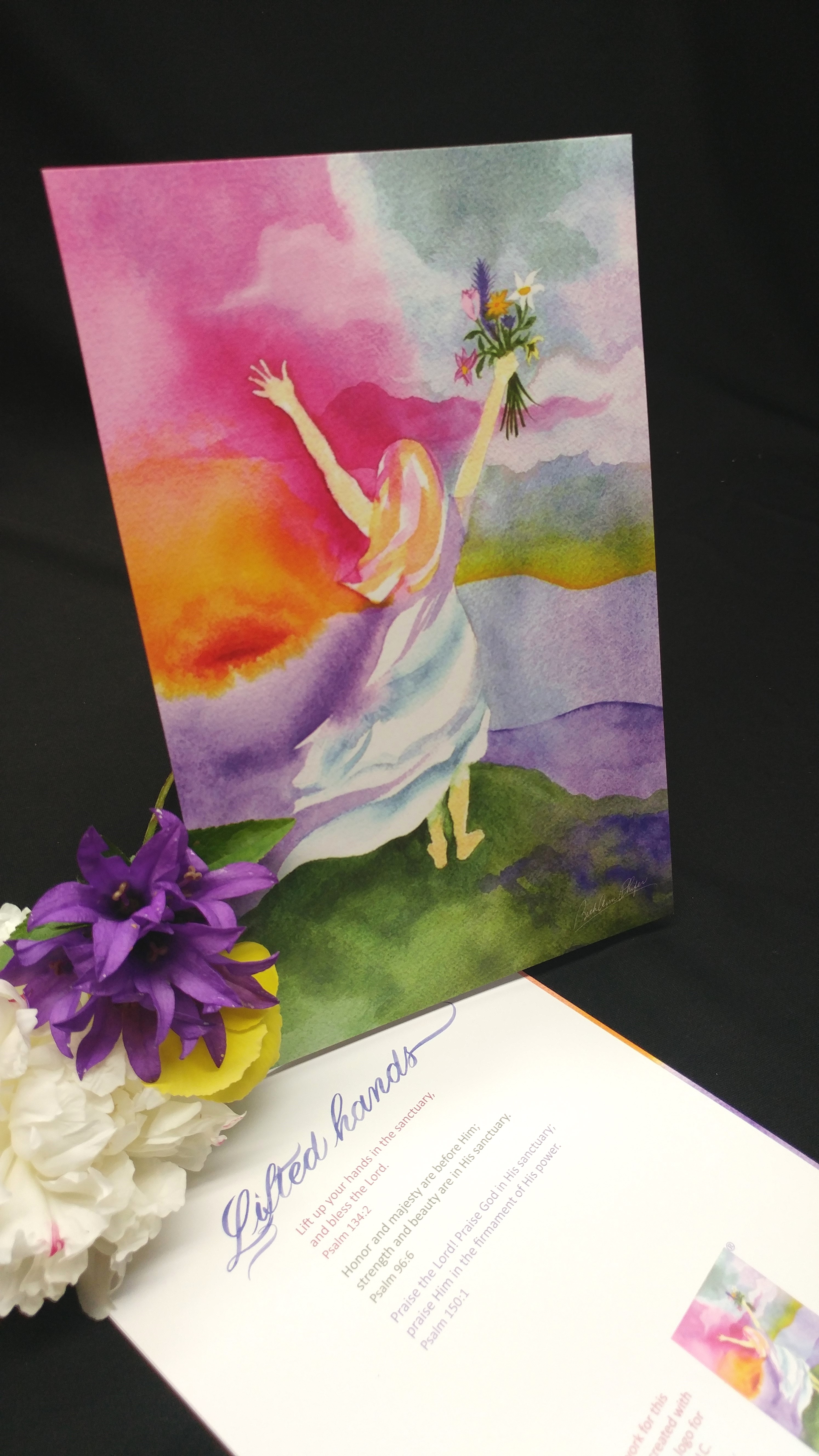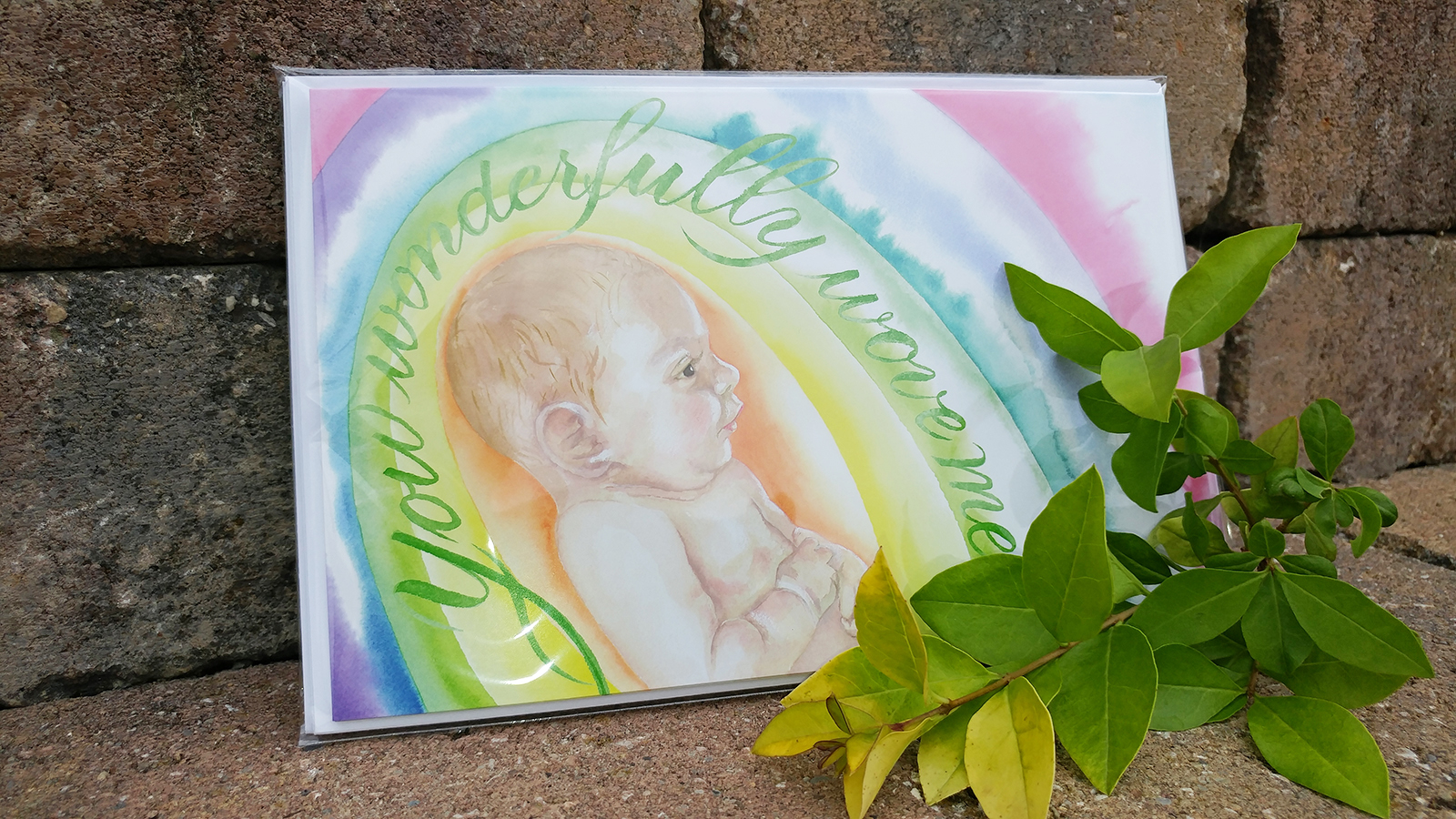 Woven is gently painted with watercolor, a pointed brush and touches of white pastel. It includes portions of Psalm 139 on the back in paraphrase form. It may be given to celebrate a birthday, a new baby, Mother’s Day, or to encourage a friend that God had them in mind before the foundation of the world.