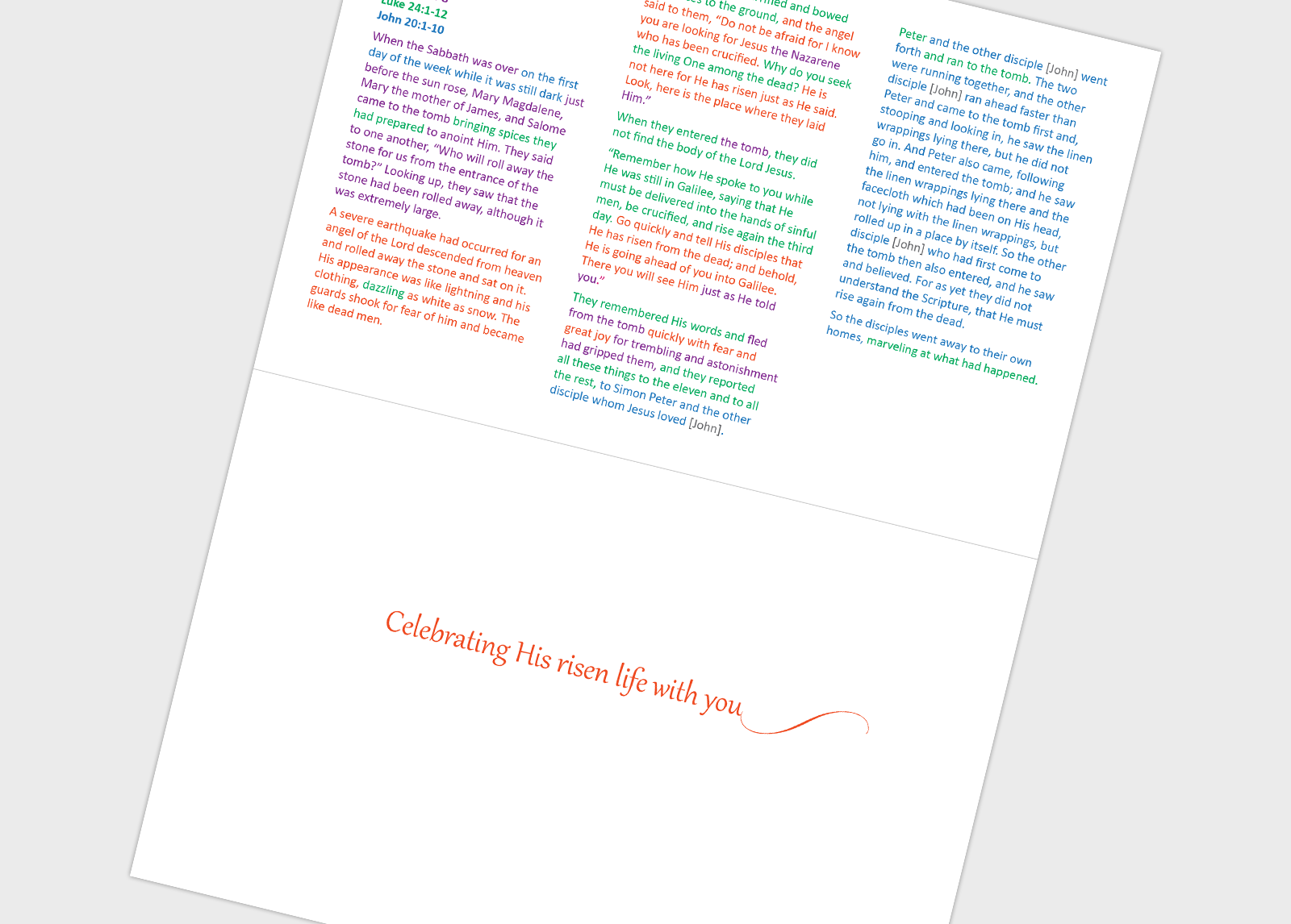 Text on the back: A merging of the accounts of the Lord’s resurrection from all four Gospels (color coded).