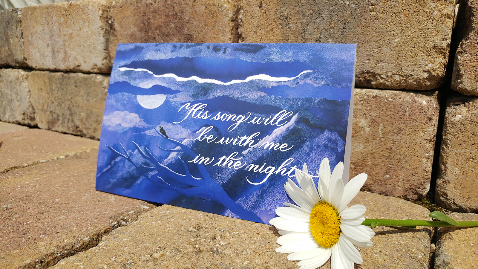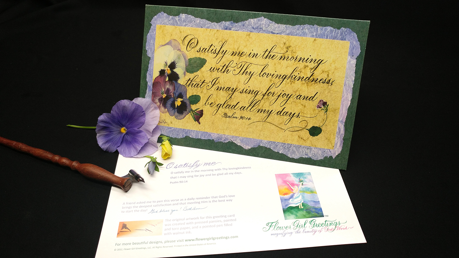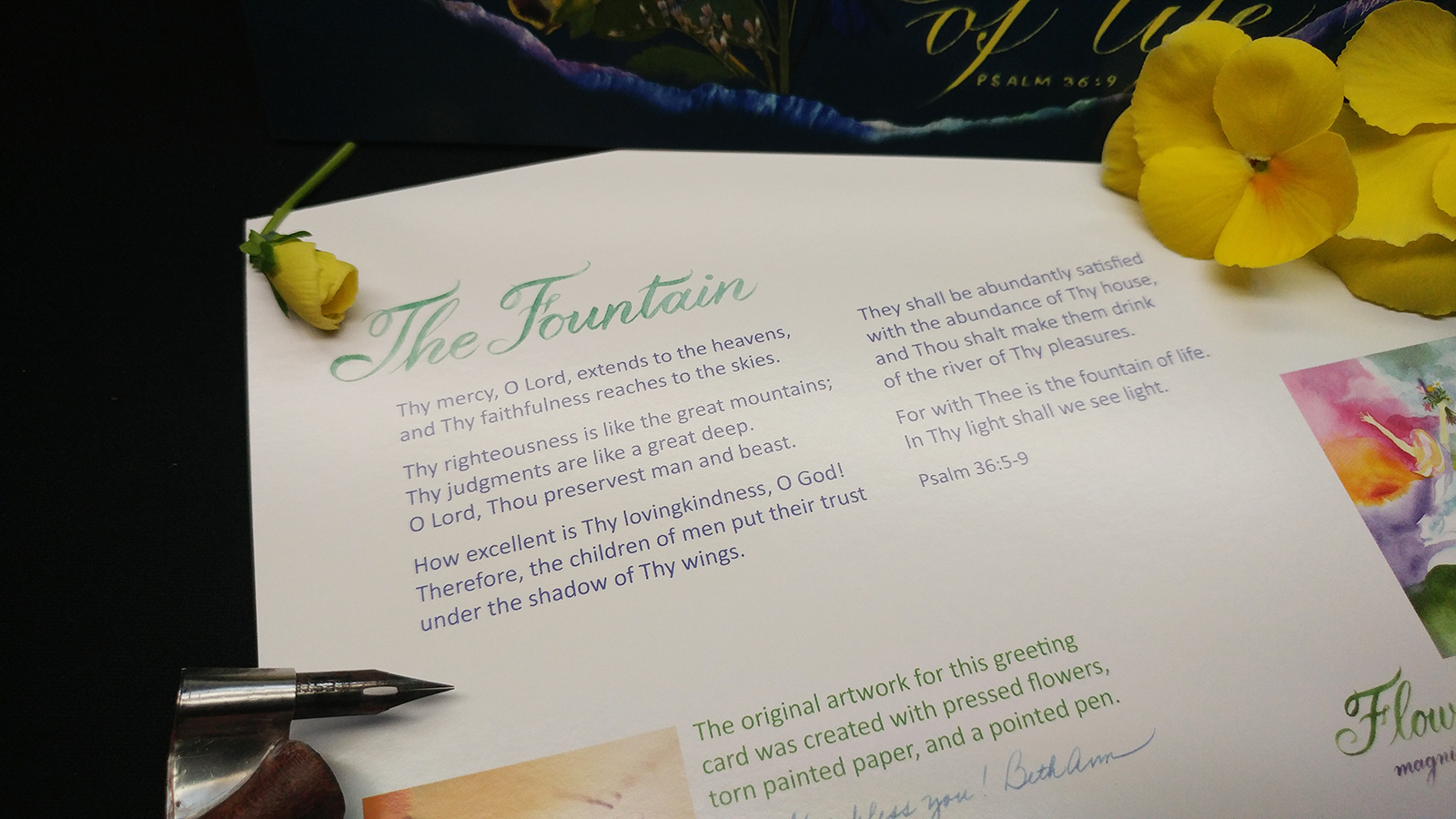 Card back: Psalm 36:5-9, “Thy mercy, O Lord, extends to the heavens, and Thy faithfulness reaches to the skies…”