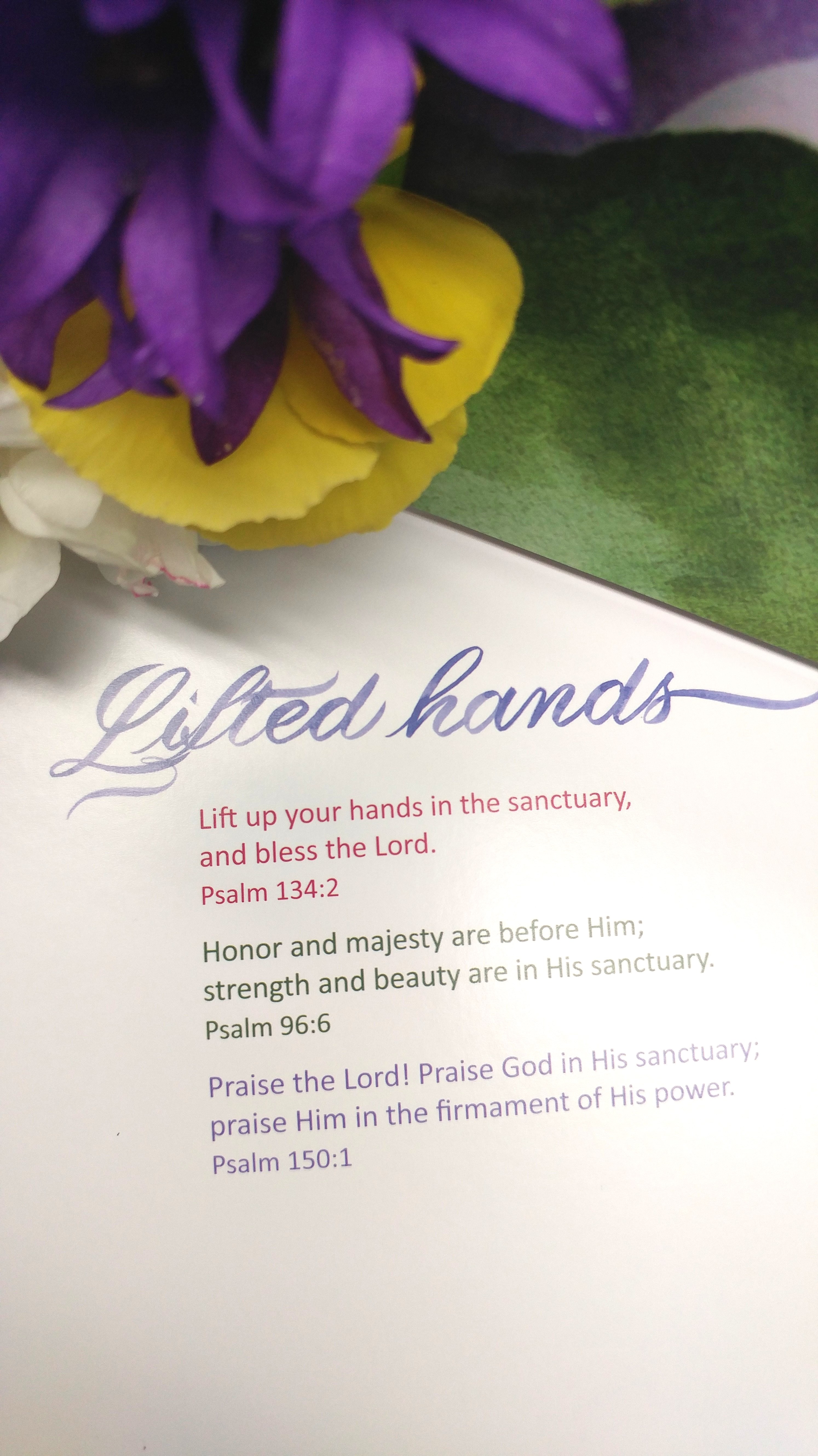 Text on the back is from Psalm 68:24-26 and Psalm 34:1-4.