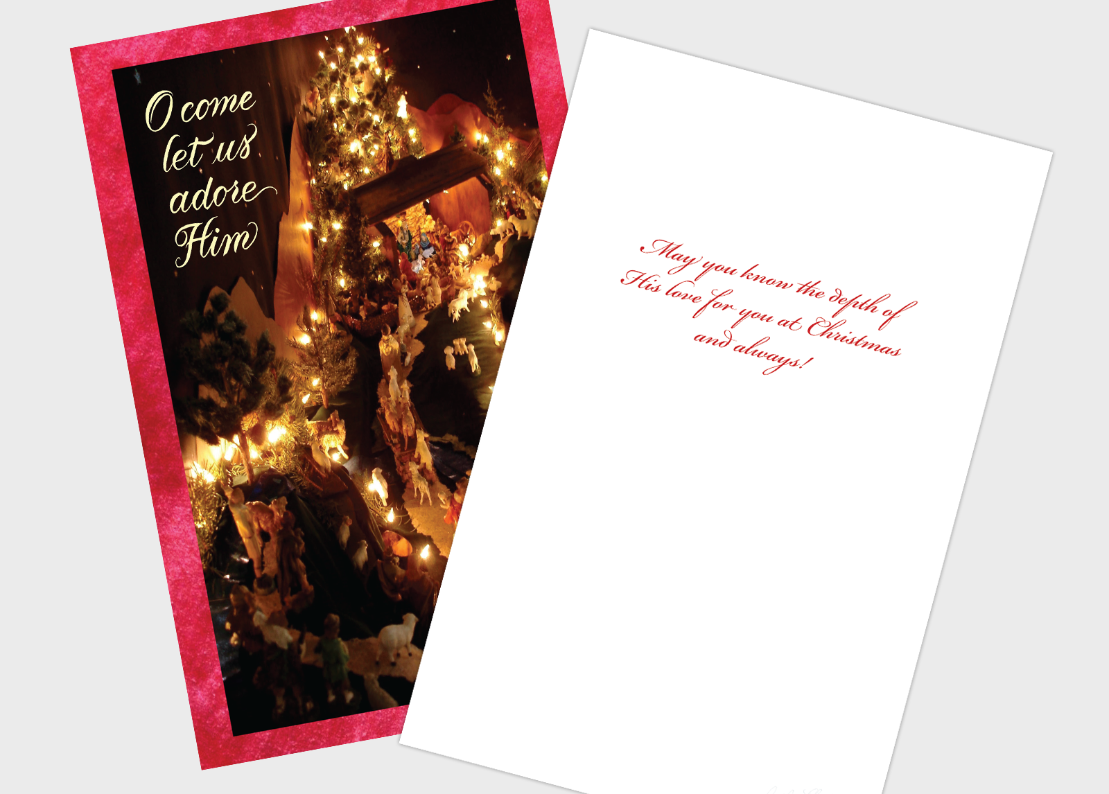 Card front – “O come let us adore Him!” plus a photograph of the artist’s nativity!
