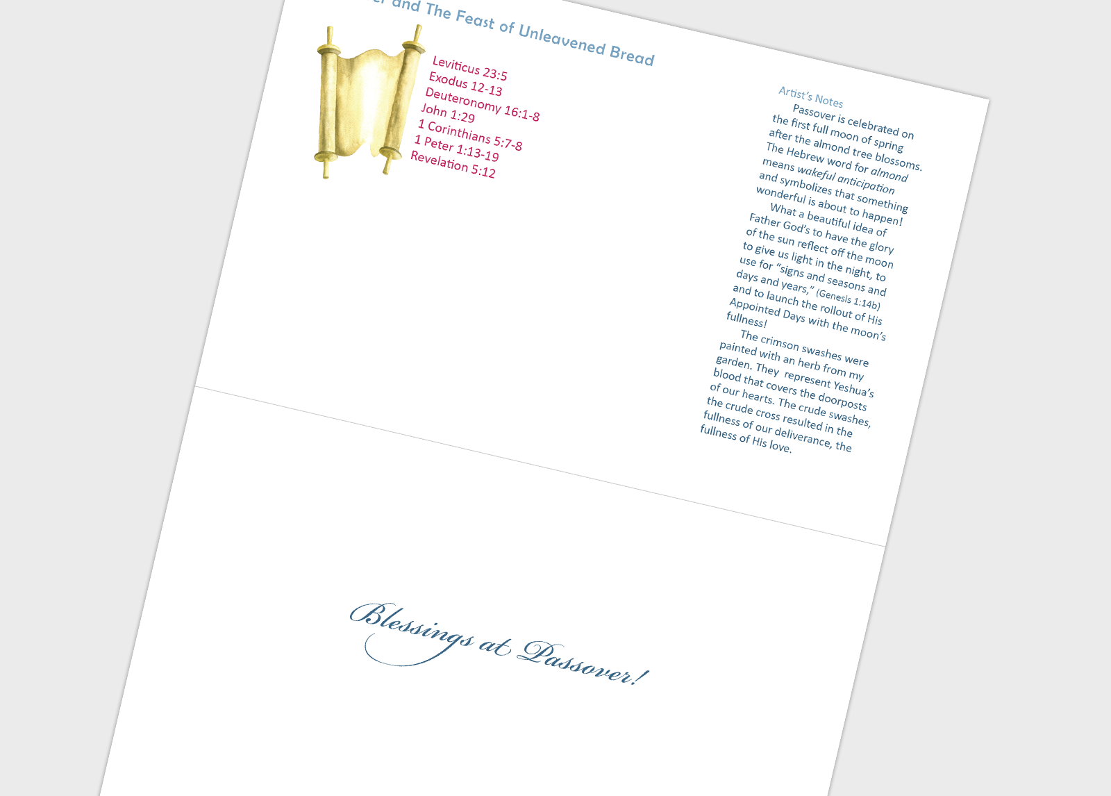 The Passover and Feast of Unleavened Bread art card is part of the Feasts of Israel Fulfilled Collection. To see this card in its Collection, please click here.