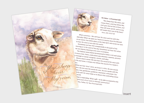 The one-page insert contains an encouraging devotional called His Voice – A Promised Gift with John 10:27-28 as the reference. The three verses on the back of the insert are: John 10:14-16; Isaiah 40:11; and Psalm 143:8.