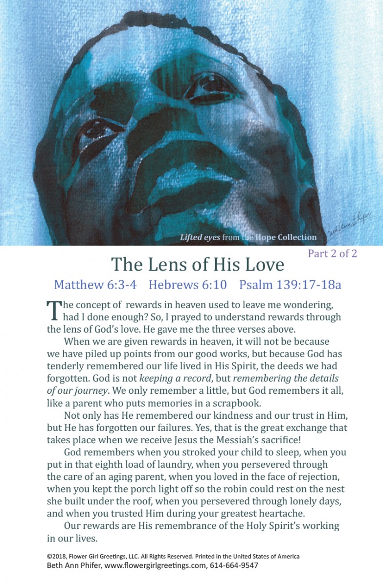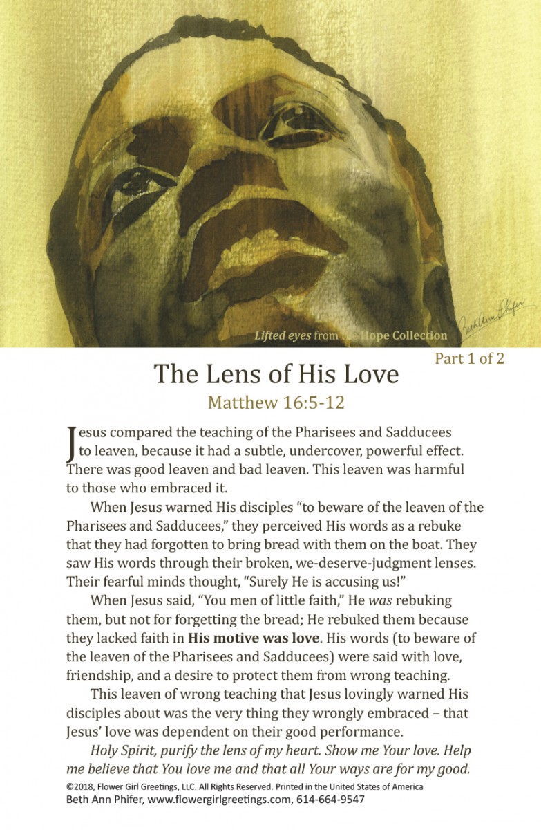 Includes two devotions about understanding Scripture from the lens of His love. This 5.5 x 8.5-inch, front/back Devotion Page can be slipped into any Flower Girl Greetings art card. Only one regular stamp would be required to mail both. It may also be used for group Bible study, personal devotion and framing. Please see the images in the scroll to view the contents of this devotion.