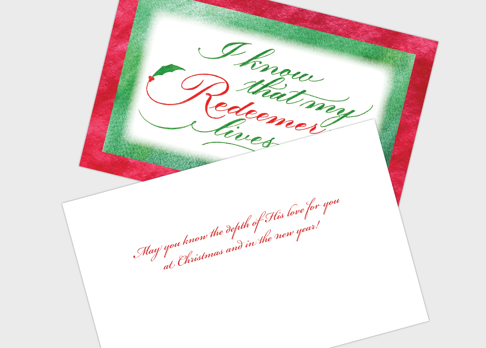 Text on the back is from Job 19:25-27 and Ephesians 1:5-8