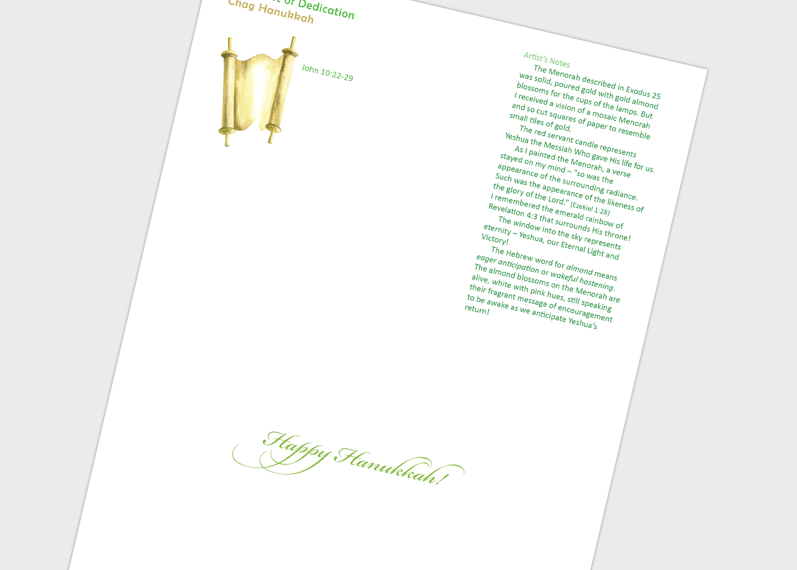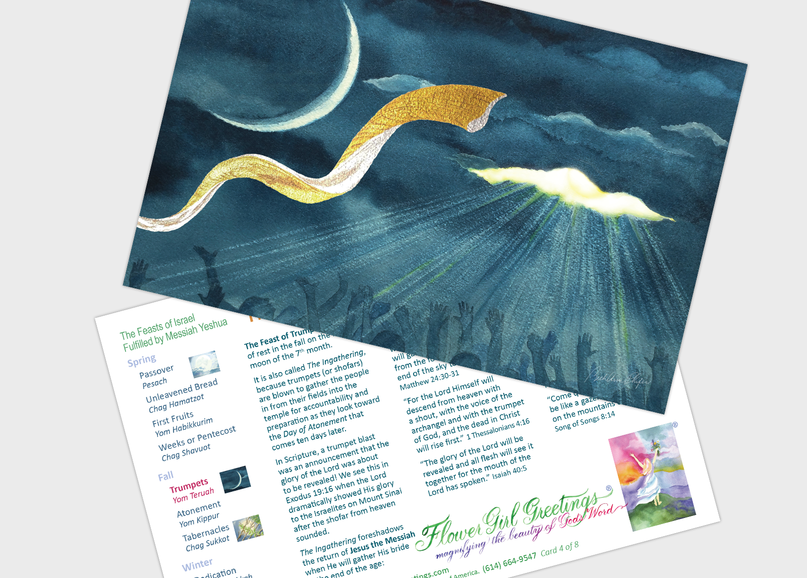 This rich Collection of 8 watercolor art cards celebrates the fulfillment of the Feasts of Israel by Yeshua (Jesus) the Messiah. The artwork on the front of each card was designed to convey Old and New Testament truth. The back of each card includes the story behind each feast and Yeshua's fulfillment of the feast. The inside of each card includes the English and Hebrew names of each feast, Scripture references, the artist’s notes and a celebration greeting!