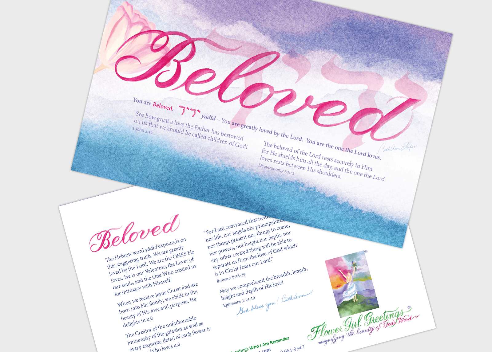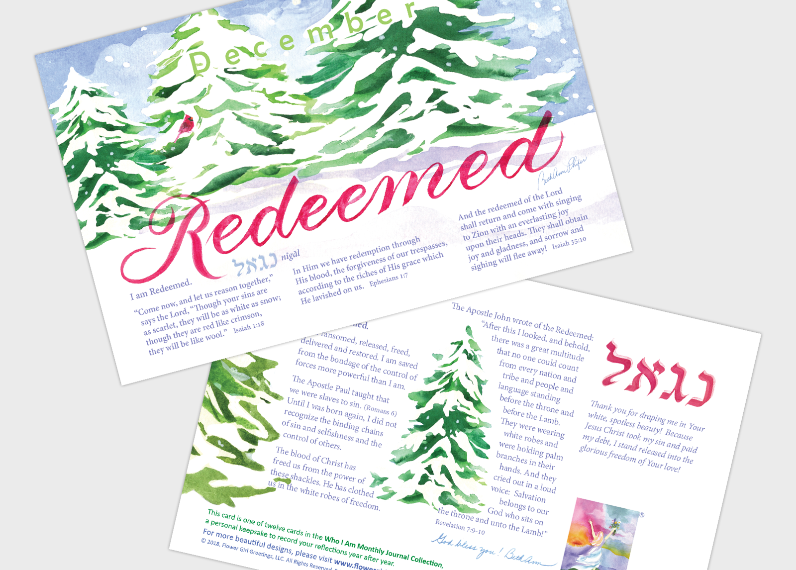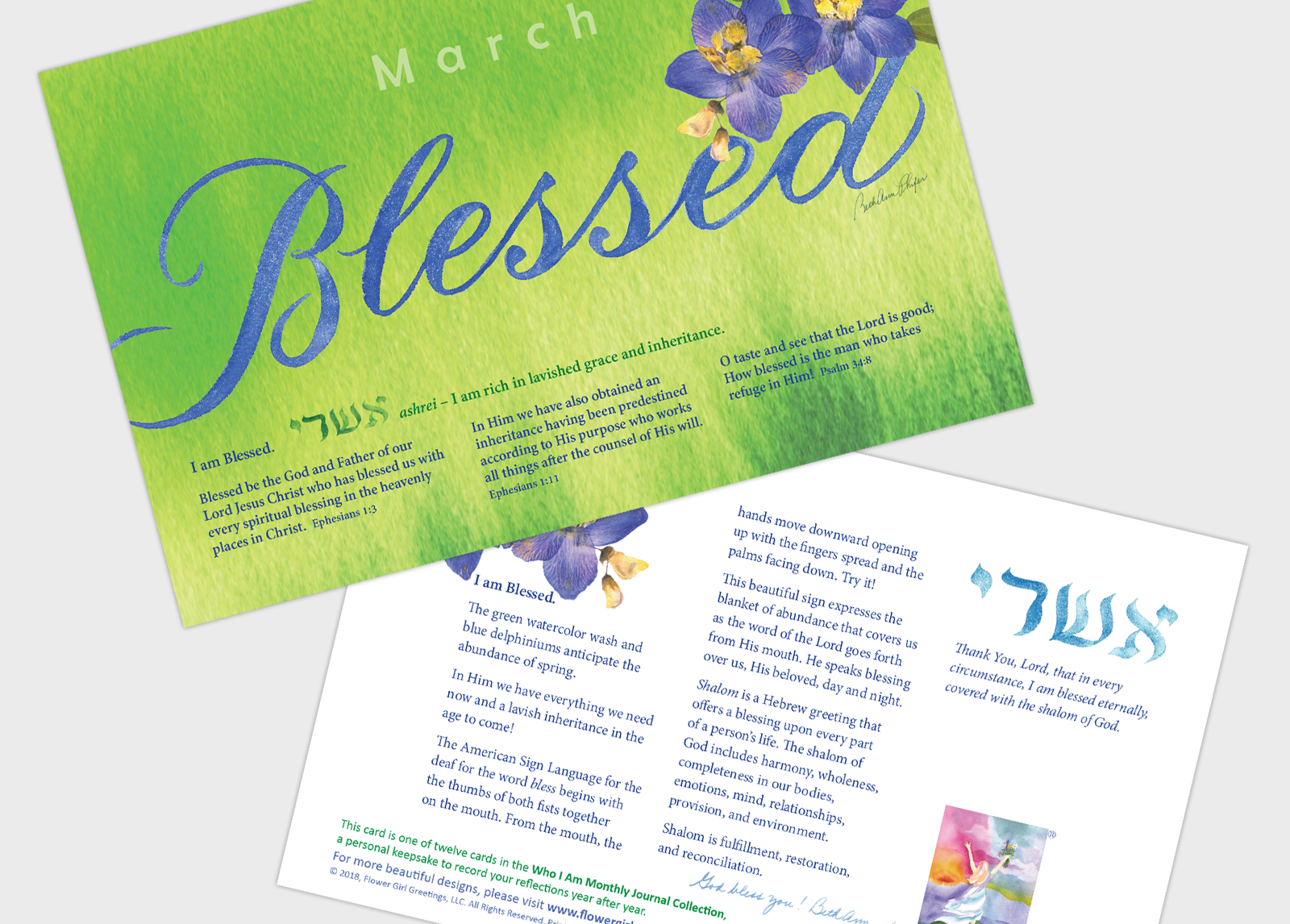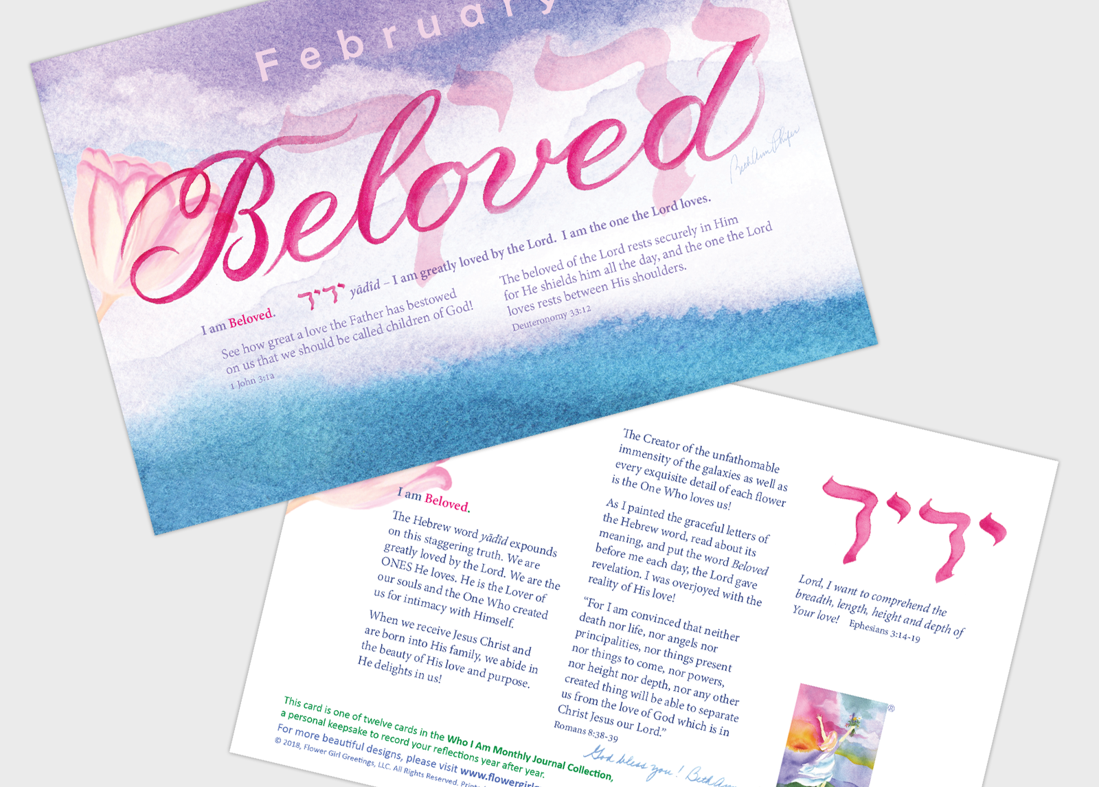 Six of the 12 prints from the Who I Am Journal Collection have been modified for this Collection to become greeting cards that focus on the recipient and are not associated with months of the year. As the artist, I send these cards often for birthdays, anniversaries, encouragement and all occasions! They are blank inside and include grace-filled devotionals on the back. Let someone know they are Beloved, Blessed, Beautiful to God, Hidden in His love, a Reflector of His grace, or Redeemed.