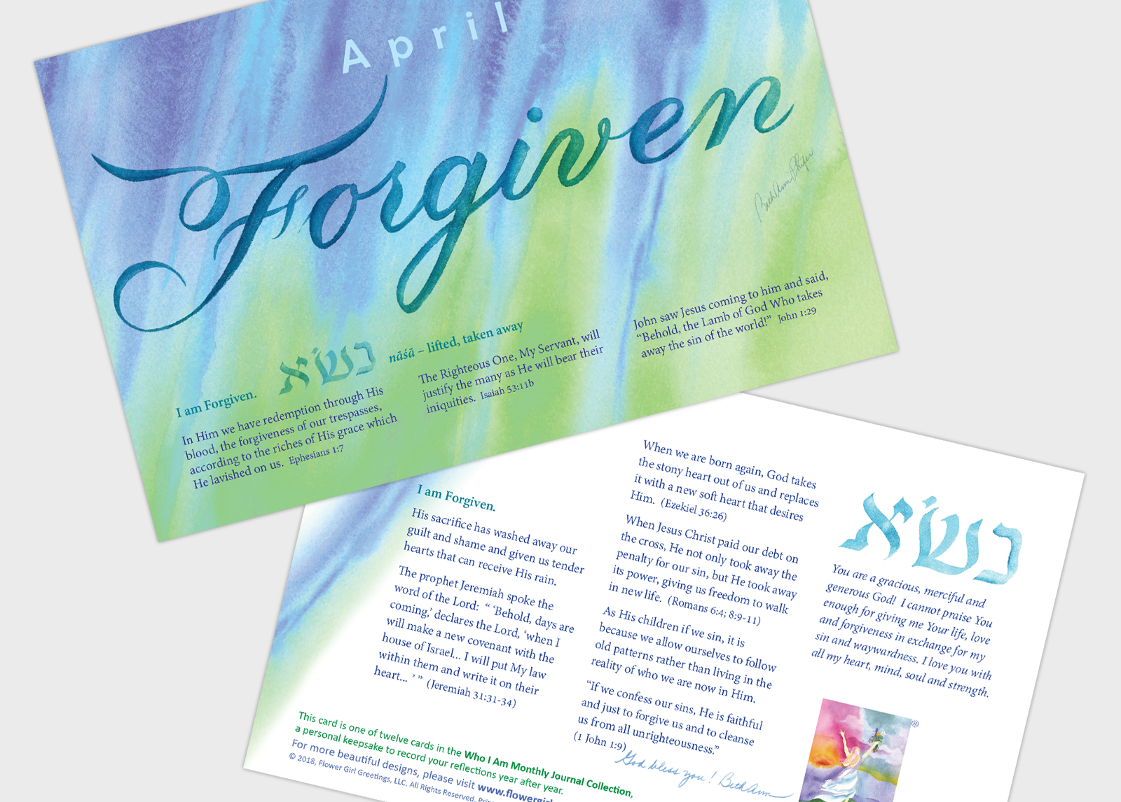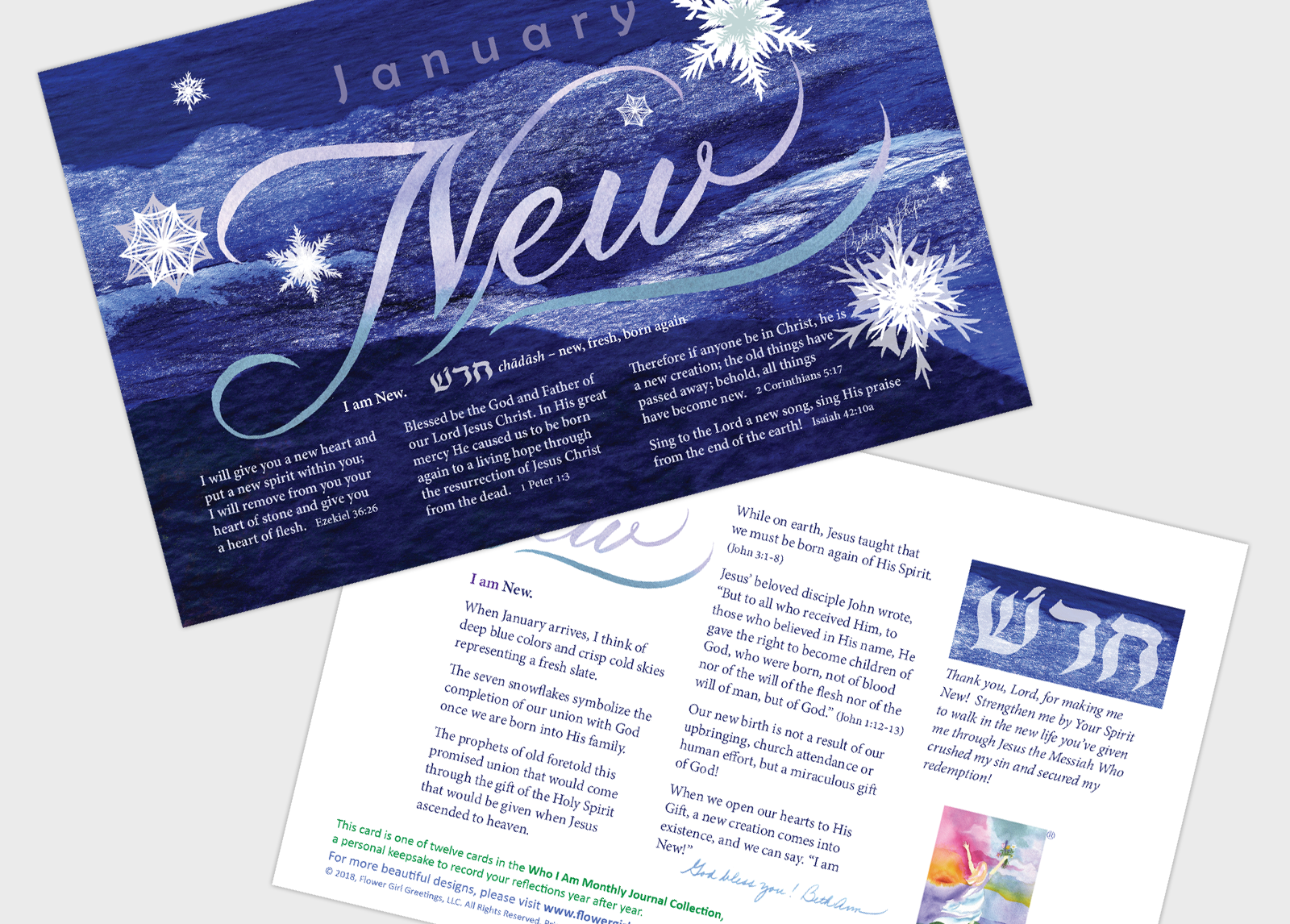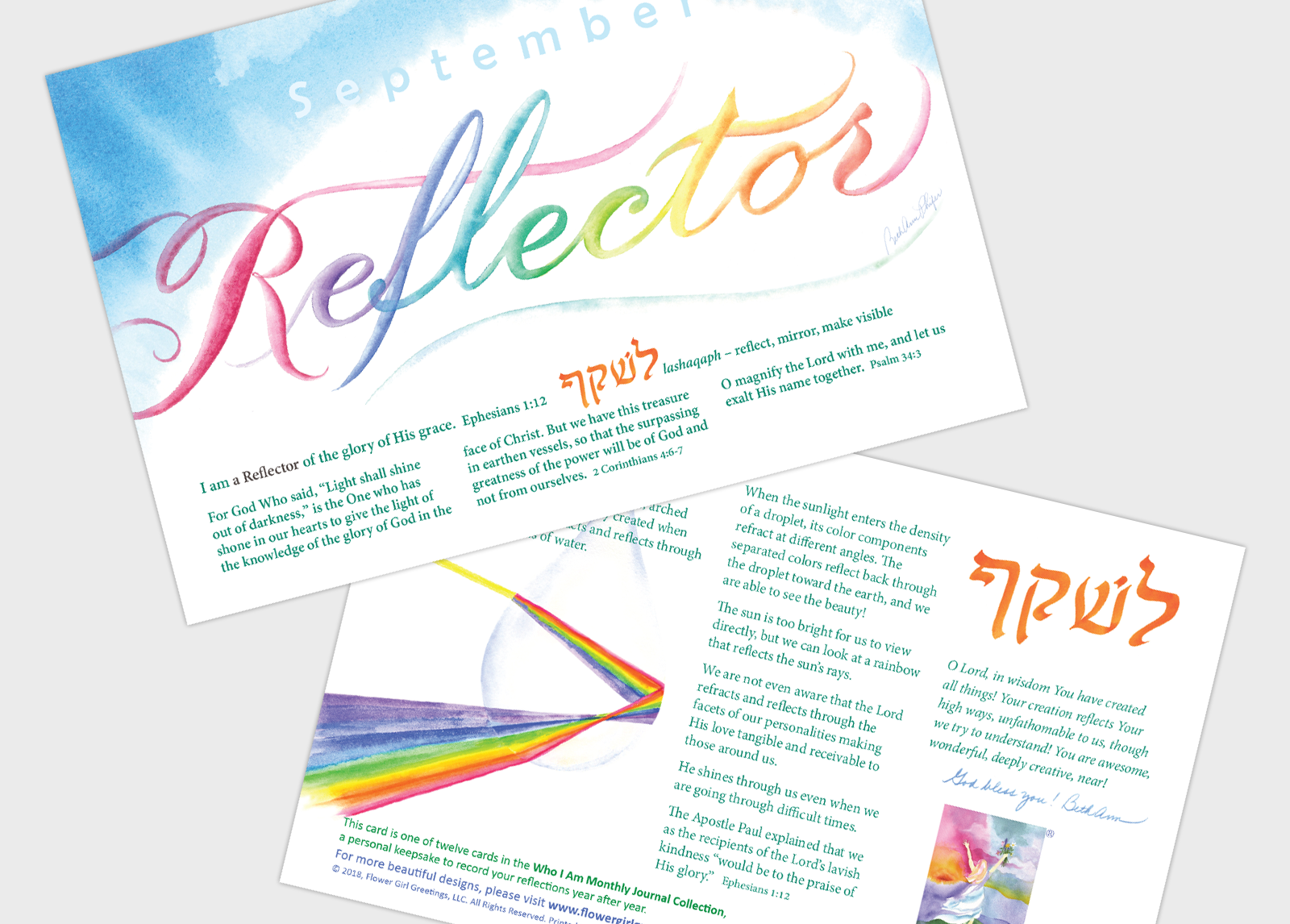 Six of the 12 prints from the Who I Am Journal Collection have been modified for this Collection to become greeting cards that focus on the recipient and are not associated with months of the year. As the artist, I send these cards often for birthdays, anniversaries, encouragement and all occasions! They are blank inside and include grace-filled devotionals on the back. Let someone know they are Beloved, Blessed, Beautiful to God, Hidden in His love, a Reflector of His grace, or Redeemed.