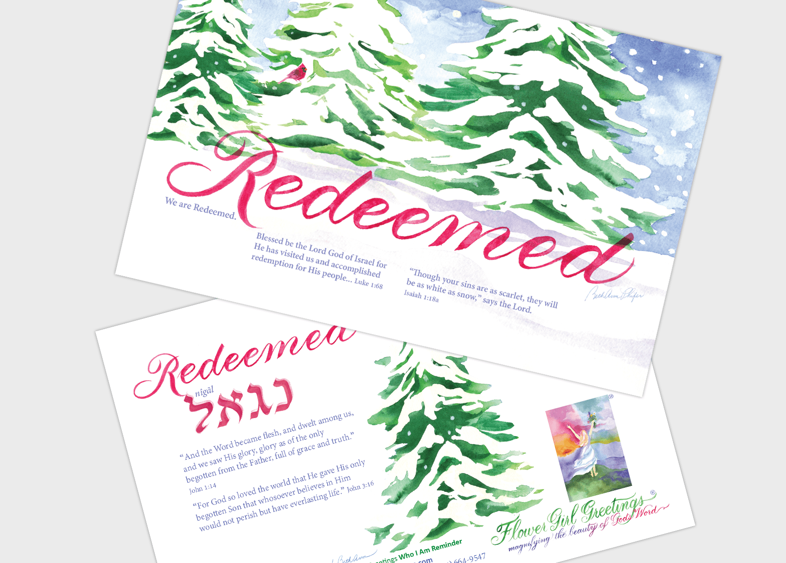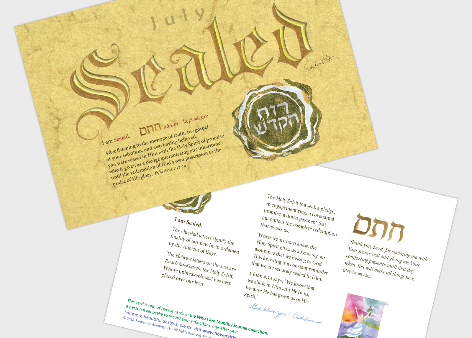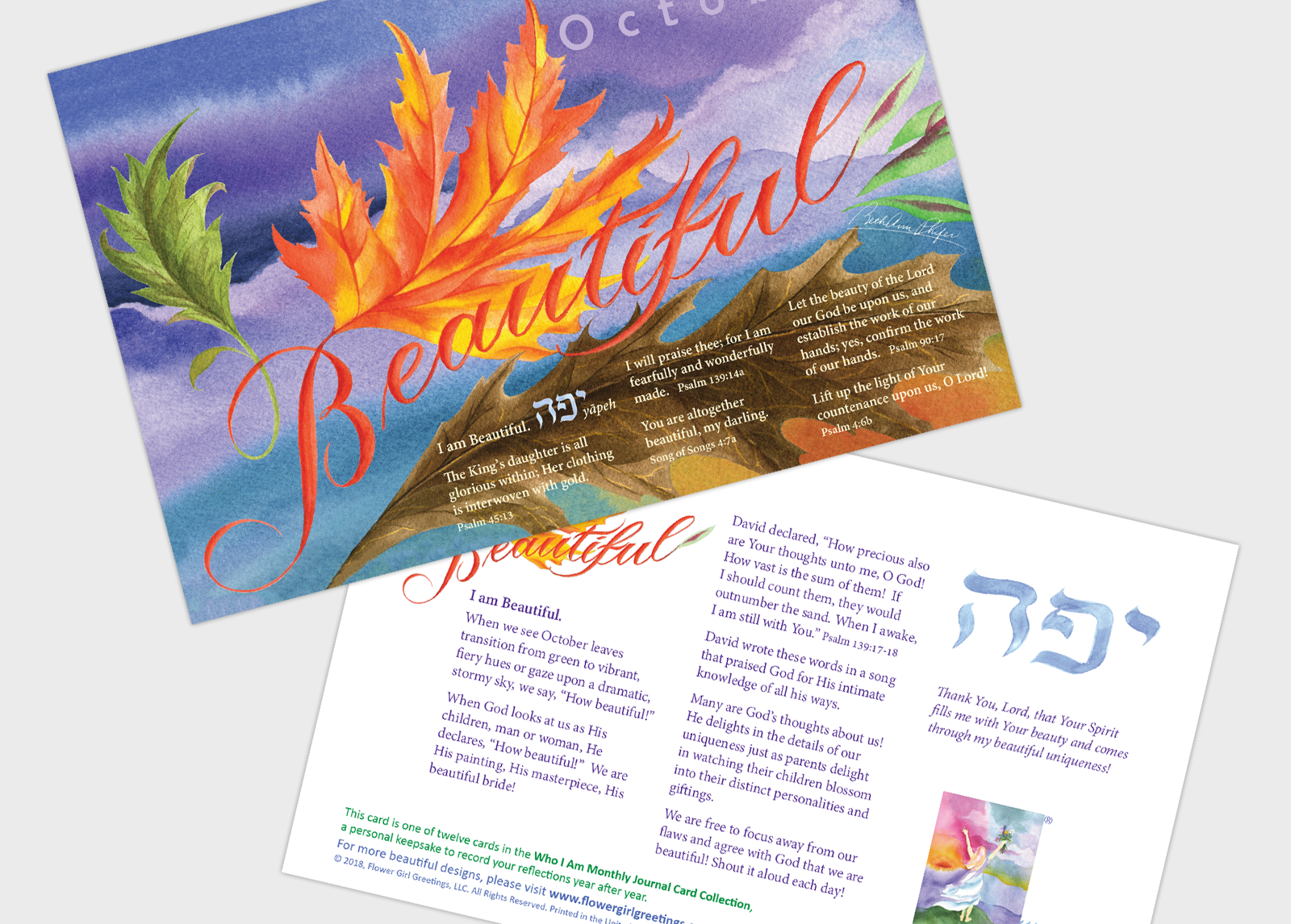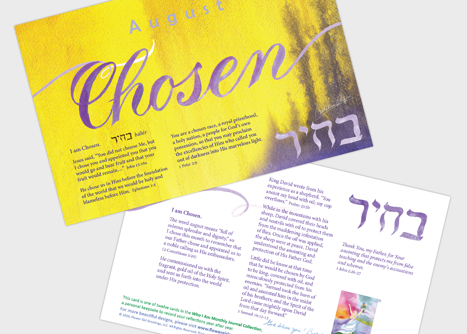 Six of the 12 prints from the Who I Am Journal Collection have been modified for this Collection to become greeting cards that focus on the recipient and are not associated with months of the year. As the artist, I send these cards often for birthdays, anniversaries, encouragement and all occasions! They are blank inside and include grace-filled devotionals on the back. Let someone know they are Beloved, Blessed, Beautiful to God, Hidden in His love, a Reflector of His grace, or Redeemed.