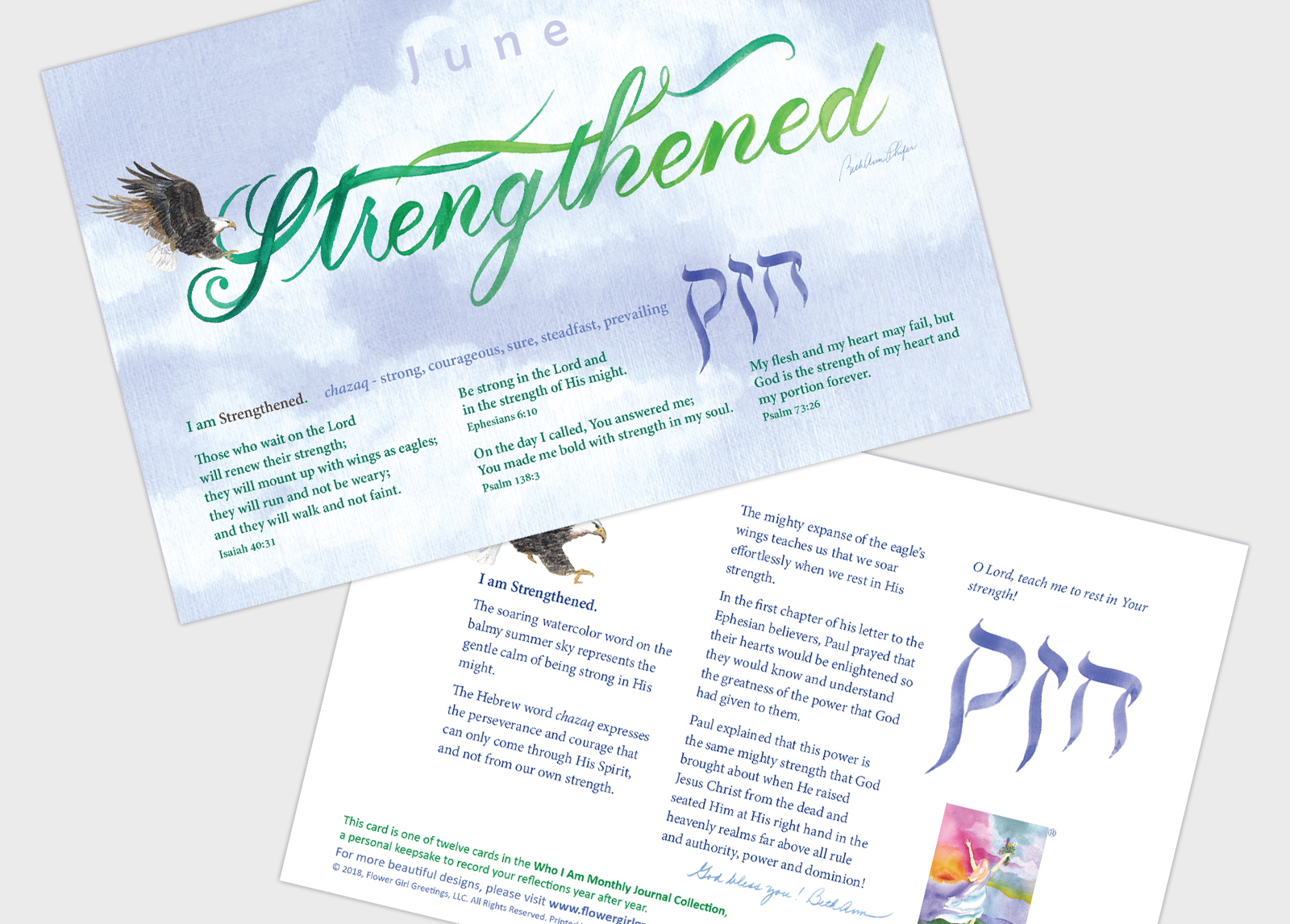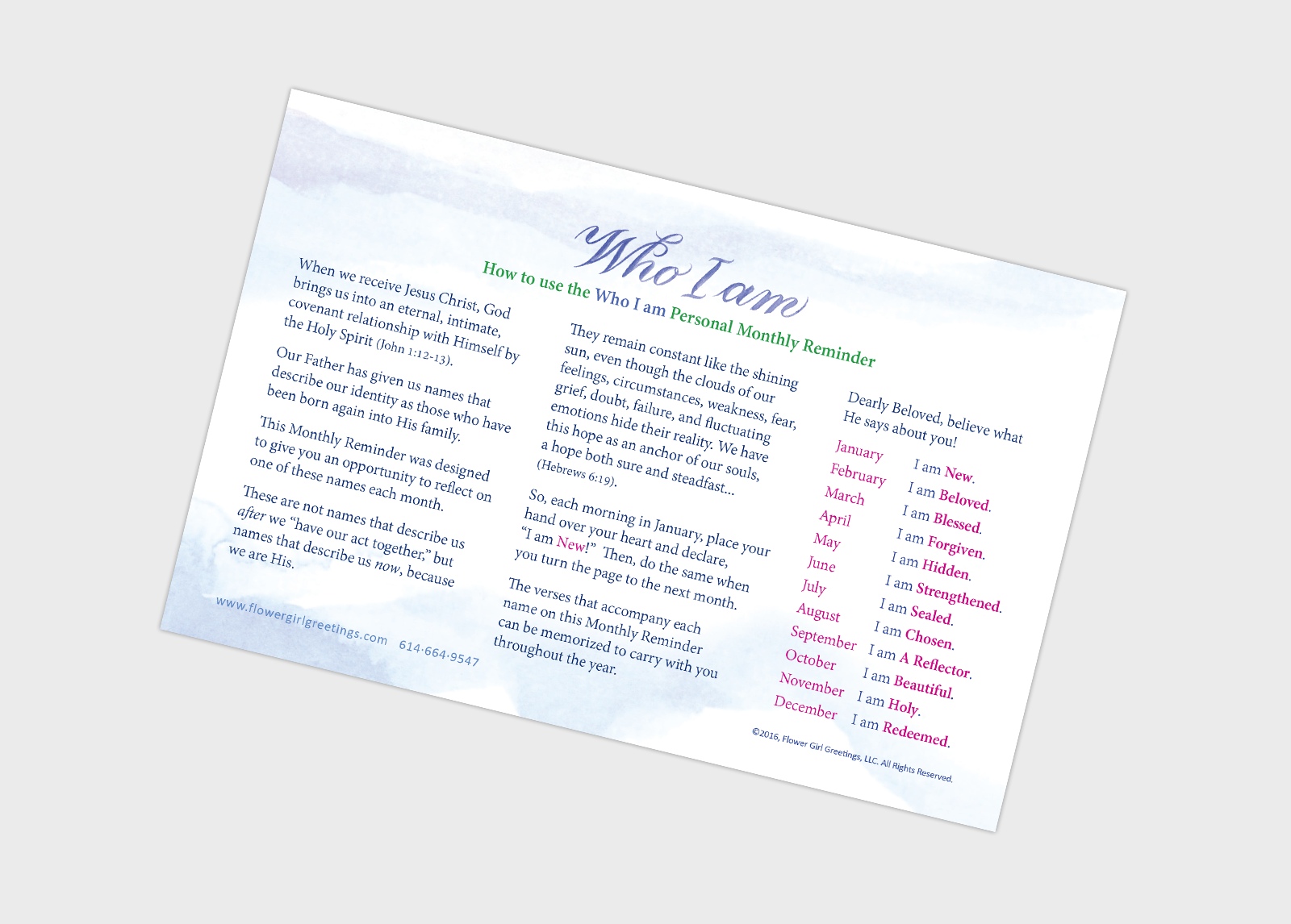 “Wow! God is using the Who I Am Monthly Reminders! I read one selection for my Tuesday Bible study here at work, and it was AMAZING! The Holy Spirit showed up and took over the class. It was beautiful, wonderful, and I just want you to know I am going to keep using your beautiful cards, calendars and other products until God takes me home. You are affecting women and men for God’s glory!” Laura – Ohio